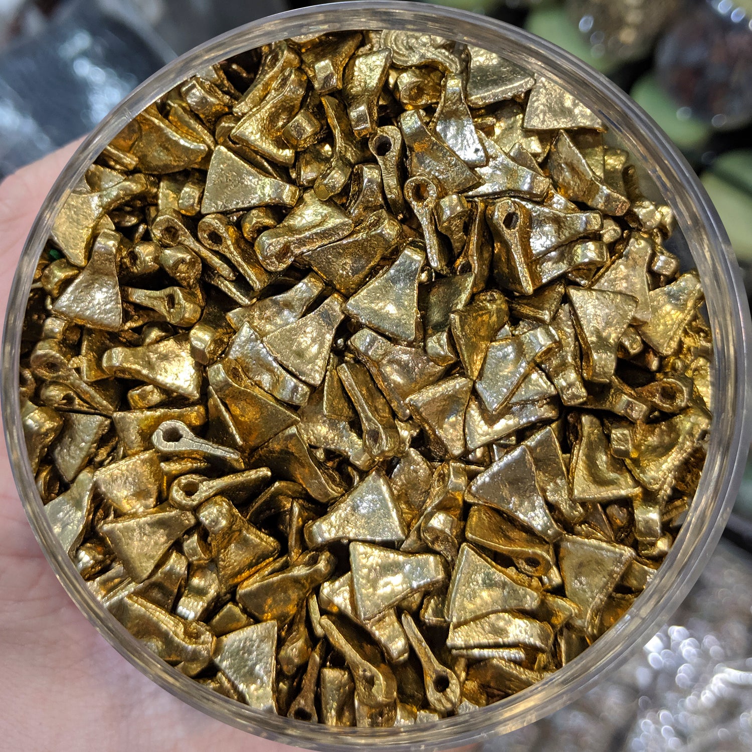 Our charms are made by pouring liquefied brass into a mold the shape of the charm. Once cooled, charms are removed from the mold and hand-brushed clean. Our brass pieces contain no nickel, so they will never tarnish or turn your skin green.